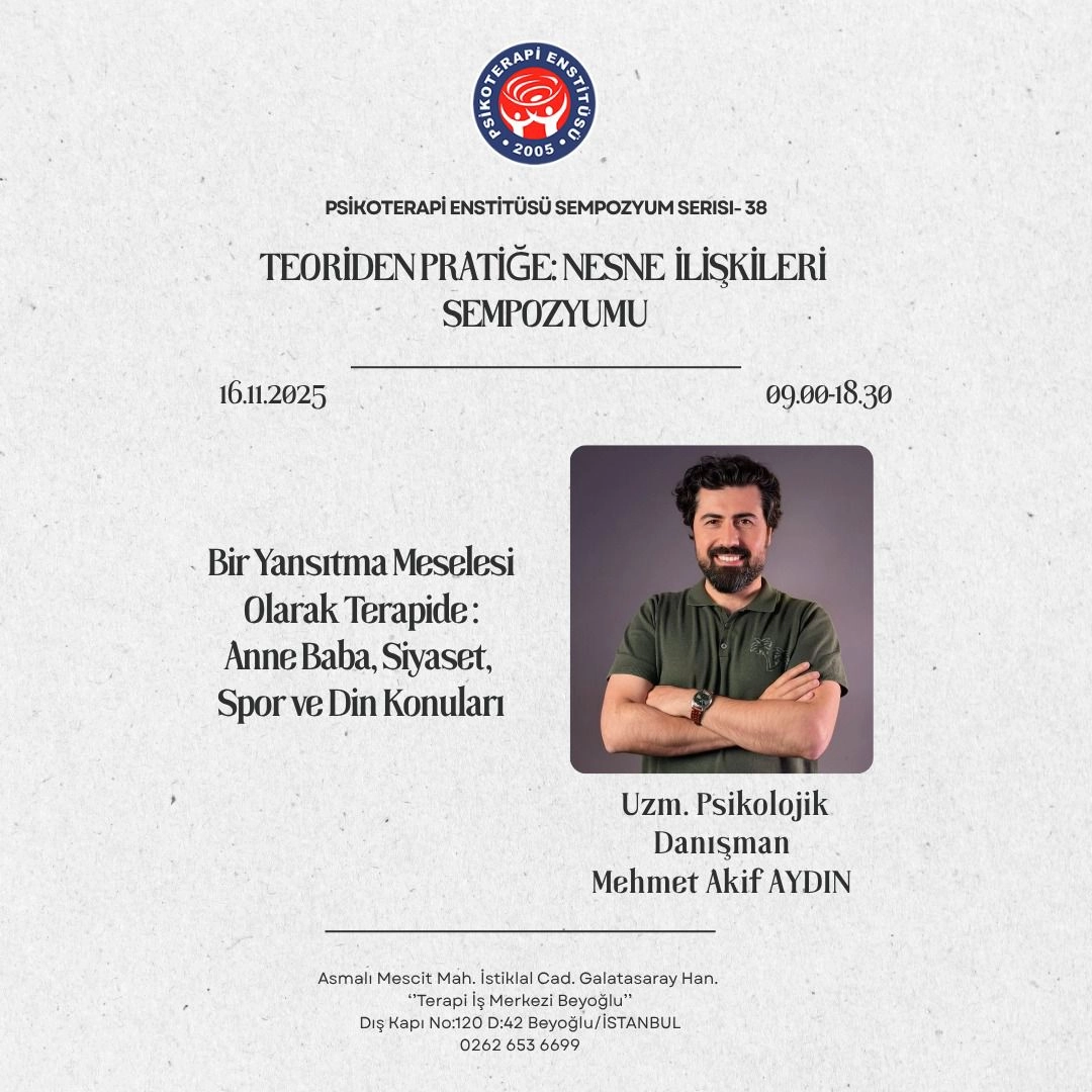 16 Kasım 2025 tarihinde, İstanbul Beyoğlu’nda Psikoterapi Enstitüsü’nün düzenlediği Teoriden Pratiğe Nesne İlişkileri Sempozyumu, psikoterapi alanında çalışan uzmanlar için oldukça verimli bir buluşma noktası oldu. Kurucumuz Mehmet Akif Aydın, bu değerli sempozyumda “Bir yansıtma meselesi olarak terapide anne baba, spor, siyaset ve din konuları” başlıklı kapsamlı bir sunum gerçekleştirdi.
