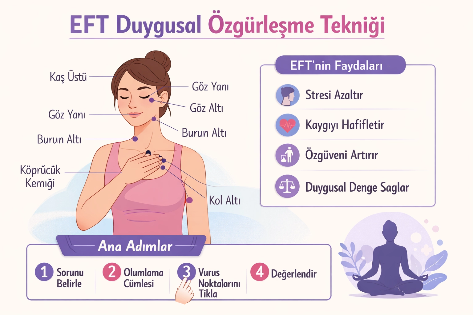 EFT duygusal özgürleşme tekniği, duygularla sağlıklı bir ilişki kurmayı destekleyen pratik bir yöntemdir. Kişinin duygularını bastırmak yerine fark etmesine ve düzenlemesine yardımcı olur.