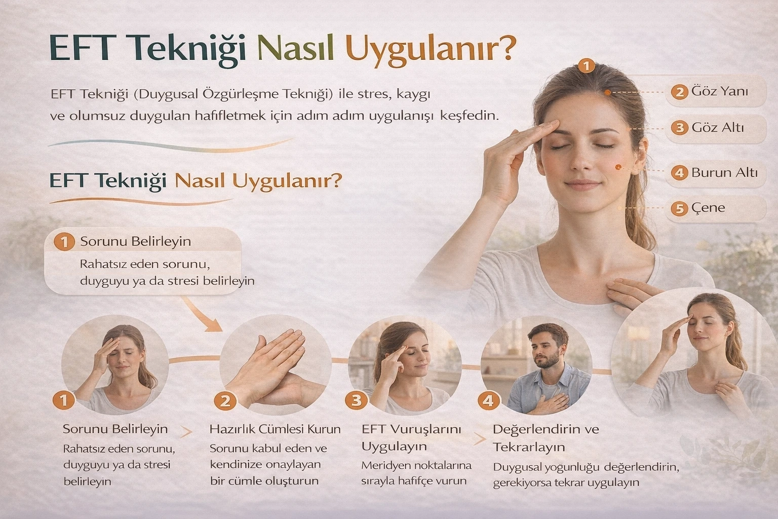 EFT, yani Duygusal Özgürleşme Tekniği, kişinin yaşadığı stres, kaygı, korku, öfke, duygusal sıkışma ve olumsuz düşünce yoğunluğunu hafifletmeye yardımcı olmayı amaçlayan bir yöntemdir. Bu teknik, kişinin rahatsızlık veren duyguya odaklanırken bedenin belirli noktalarına hafif vuruşlar yapması esasına dayanır. Uygulama sırasında sorunla bağlantılı kısa ifadeler ya da kabul cümleleri de kullanılabilir. Bu yönüyle EFT, beden ve zihin arasındaki bağlantıyı dikkate alan bütüncül bir yaklaşım olarak değerlendirilir.